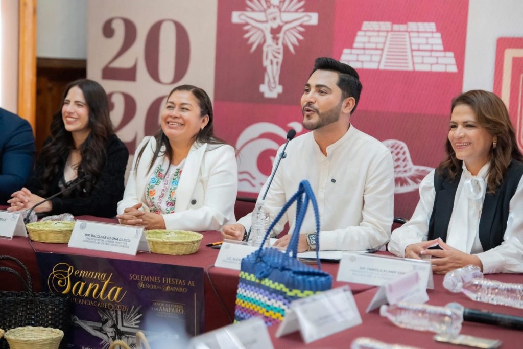 Huandacareo, Michoacán.– Con el propósito de promover el turismo regional y fortalecer las tradiciones culturales y religiosas, la diputada Belinda Iturbide participó en una rueda de prensa junto al presidente municipal de Huandacareo, Alexis Velázquez, donde hicieron una cordial invitación a la ciudadanía para visitar este municipio durante la próxima Semana Santa.