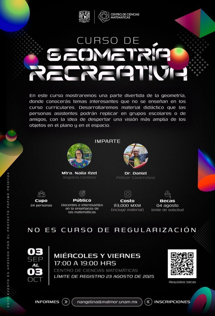 Por último, en el Curso de Geometría Recreativa, que se impartirá del 3 de septiembre al 3 de octubre, de manera presencial, se mostrará la geometría de una manera entretenida y atractiva, donde conocerás temas interesantes que no se enseñan en los cursos curriculares. Desarrollaremos material didáctico que las personas asistentes podrán replicar en grupos escolares o de amigos, con la idea de despertar una visión más amplia de los objetos en el plano y el espacio. El enfoque educativo es a nivel de educación básica, por lo que este curso en particular podría capacitar y apoyar a los docentes en su labor de enseñanza. Así, a su vez, impulsar el estudio de esta ciencia en el estado. La fecha límite para solicitar una beca será el 15 de agosto de 2025 y la información completa se encuentra en el enlace https://drive.matmor.unam.mx/s/eoa6AW8rFjaQPQC/preview