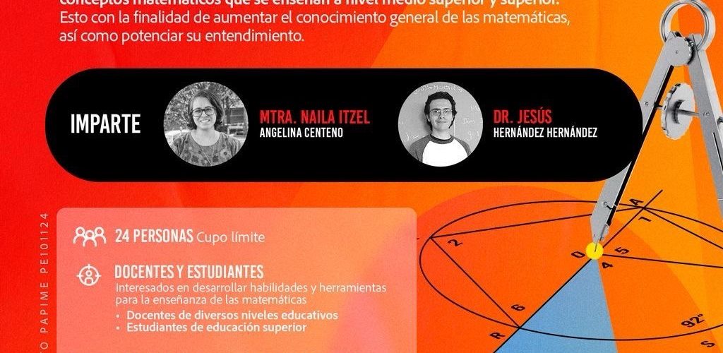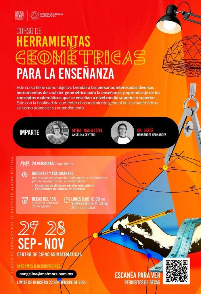 En el curso Herramientas Geométricas para la Enseñanza, del 29 de septiembre al 28 de noviembre, el objetivo es brindar diversas herramientas de carácter geométrico para la enseñanza y el aprendizaje de los conceptos matemáticos que se enseñan a nivel medio superior y superior, con énfasis en las personas interesadas en la docencia. La modalidad será presencial y el cupo máximo será de 24 personas. La fecha límite para solicitar una beca será el 29 de agosto de 2025.Asimismo, se puede encontrar más información sobre el curso en el sitio https://drive.matmor.unam.mx/s/3qmokqAQPefSnK2/preview