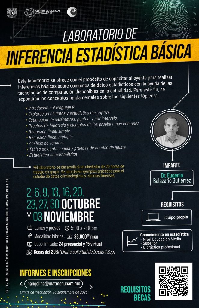Desde el “Laboratorio de inferencia estadística básica”, que se impartirá del 2 de octubre al 3 de noviembre, se busca capacitar al oyente para realizar inferencias básicas sobre conjuntos de datos estadísticos con la ayuda de las tecnologías de computación disponibles en la actualidad. Con un cupo limitado, para máximo 24 personas en modalidad presencial y 15 en modalidad virtual. Los costos, así como la solicitud de beca, se pueden consultar en: https://drive.matmor.unam.mx/s/NWDe4aSbqGfXM48/preview