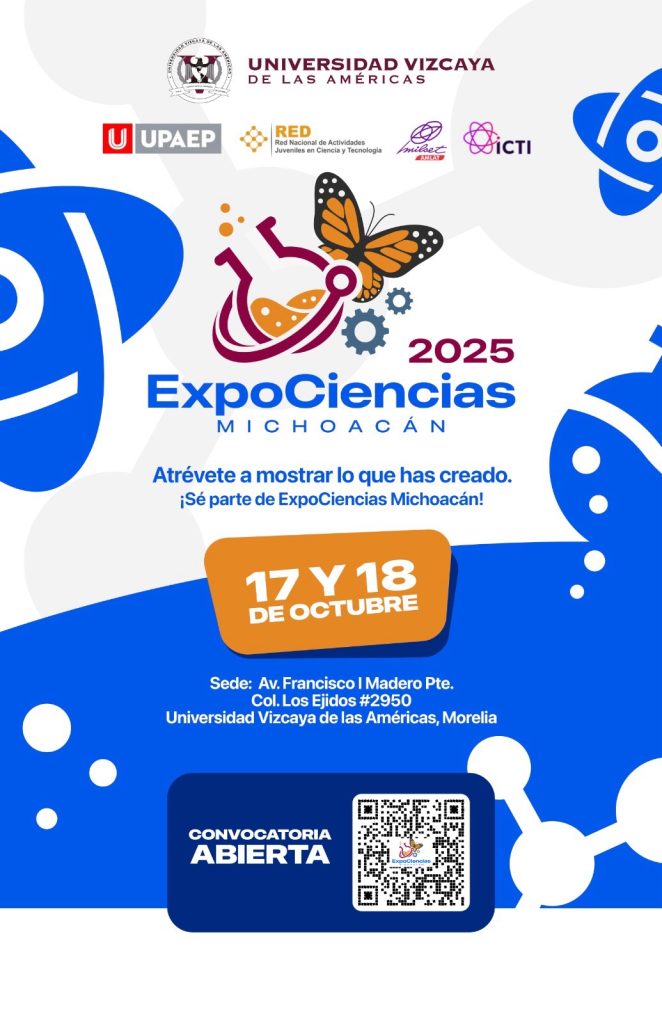 La Red Nacional de Actividades Juveniles en Ciencia y Tecnología (La RED), El Instituto de Ciencia Tecnología e Innovación (ICTI) y Universidad Vizcaya de las Américas invitan a todas las instituciones educativas del sector público y privado del estado de Michoacán a participar en ExpoCiencias Michoacán 2025.