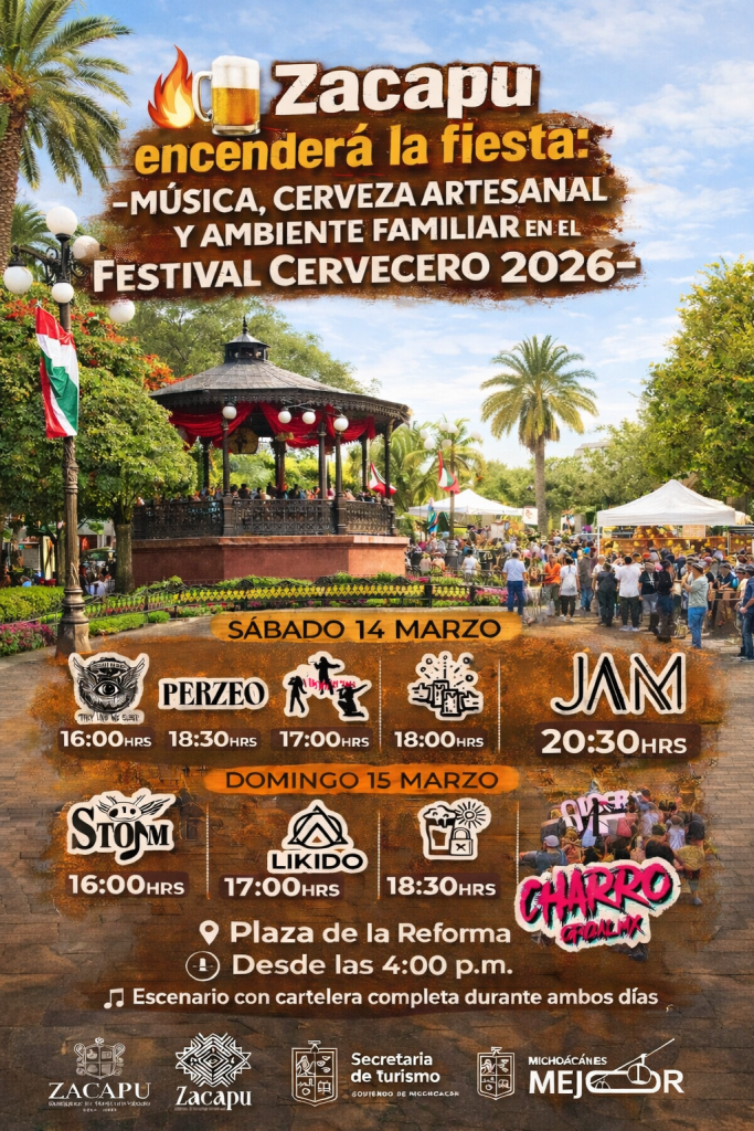 Anterior 🎸🔥 Likido encenderá el escenario principal del Festival de la Cerveza 2026; Moni Valdez respalda al rock zacapense Siguiente 🔥🍺 Zacapu encenderá la fiesta: música, cerveza artesanal y ambiente familiar en el Festival Cervecero 2026 Los próximos sábado 14 y domingo 15 de marzo, la Plaza de la Reforma Municipios, Uncategorized, Zacapu Zacapu estará de fiestas sábado 14 y domingo 15 de marzo, 🔥🍺 cerveza artesanal ambiente familiar en el Festival Cervecero 2026 3 días Publicado1 Tiempo de lectura FacebookXEmailWhatsApp Espera más detalles este domingo 12:00 MD atraves de este portal @Rooster noticias 3.3 Redacción Ver todas las publicaciones Te recomendamos leer Coeneo, Michoacán, Municipios 🤝 Valeria Aguilar fortalece la cercanía con la ciudadanía en Coeneo 9 Vistas2 Tiempo de lectura Michoacán, Zacapu Mónica Valdez Pulido encabeza arranque de campaña de vacunación contra el sarampión en Zacapu 9 Vistas2 Tiempo de lectura Cultura y fiestas Michoacán, Michoacán, Municipios, Zacapu 🙏📿 Santo Dios ya tiene nuevos cargueros; tradición que data de 1847 continúa viva en Zacapu 15 Vistas3 Tiempo de lectura Redacción View all posts Últimos videos OBRAS Y ARRANQUES DE MONI VALDEZ Y SU REGIDORES DEL GOBIERNO DE ZACAPU 9 meses Publicado DIF será un espacio para llenar corazones, Gestora / Yareth Mares 9 meses Publicado Noticias con actualidad en Zacapu y la región cada mañana lunes a viernes 8:30 am noticias de Zacapu y Michoacán 9 meses Publicado ¡Síguenos! youtube